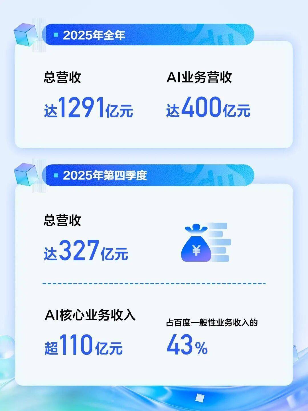 百度近日公布了2025年第四季度及全年财务业绩,展现出AI业务强劲的增长势头。全年总营收达1291亿元,其中AI业务贡献400亿元,占比显著提升。第四季度,AI业务收入占公司一般性业务收入的43%,成为推动业绩增长的核心动力。具体来看,AI云收入同比增长34%,AI原生营销服务收入激增301%,AI应用收入也突破100亿元大关,各项业务均实现跨越式发展。