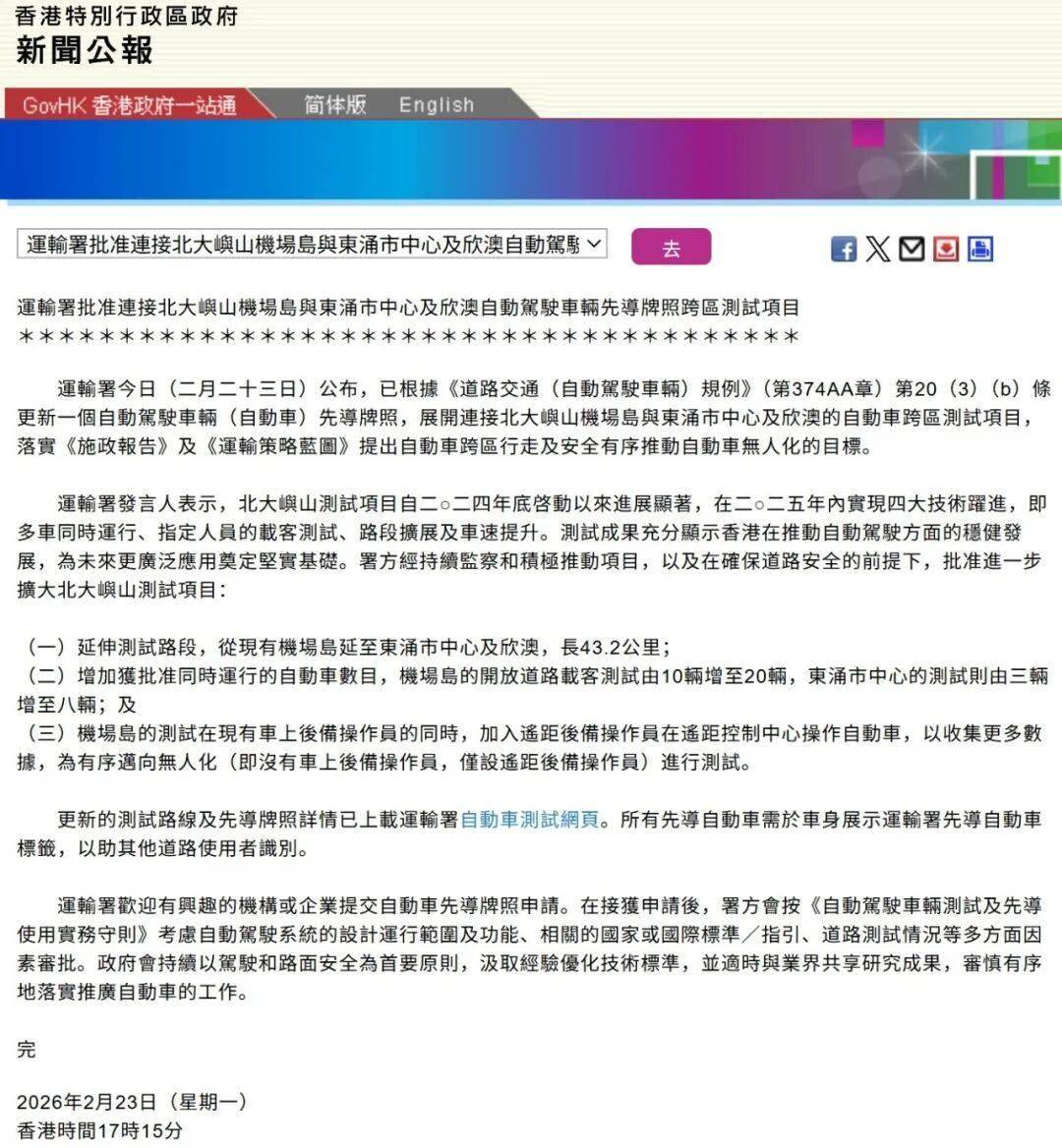 在自动驾驶领域,萝卜快跑再次取得重大突破。2月23日,香港特别行政区运输署宣布,连接北大屿山机场岛与东涌市中心及欣澳的跨区测试路线正式贯通。作为首家获批企业,萝卜快跑将率先在这条路线上开展跨区运行,实现从交通枢纽到社区末梢的无缝衔接。这是自2024年11月获得香港首张自动驾驶车辆先导牌照以来,萝卜快跑第五次扩大运营区域。截至2026年2月,其全球出行服务次数已超2000万,覆盖26个城市,自动驾驶总里程突破3亿公里,全无人驾驶里程达1.9亿公里。