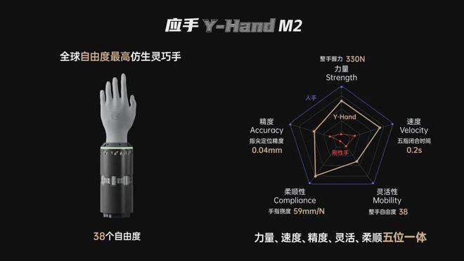 应手Y‑HandM2的研发基于任雷教授首创的仿生拉压体理论,实现了三大核心创新:通过模拟生物关节的6自由度运动机制,替代传统刚性铰链设计;集成磁集电驱人工肌肉技术,将驱动、变速与传动功能融为一体;采用刚柔耦合系统架构,在确保动力传输效率的同时提升安全交互性能。这些创新使产品在力量、速度、精度等关键指标上达到行业领先水平——整手握力达330N,五指闭合仅需0.2秒,指尖定位精度突破0.04mm,自由度数量保持38个的全球纪录。