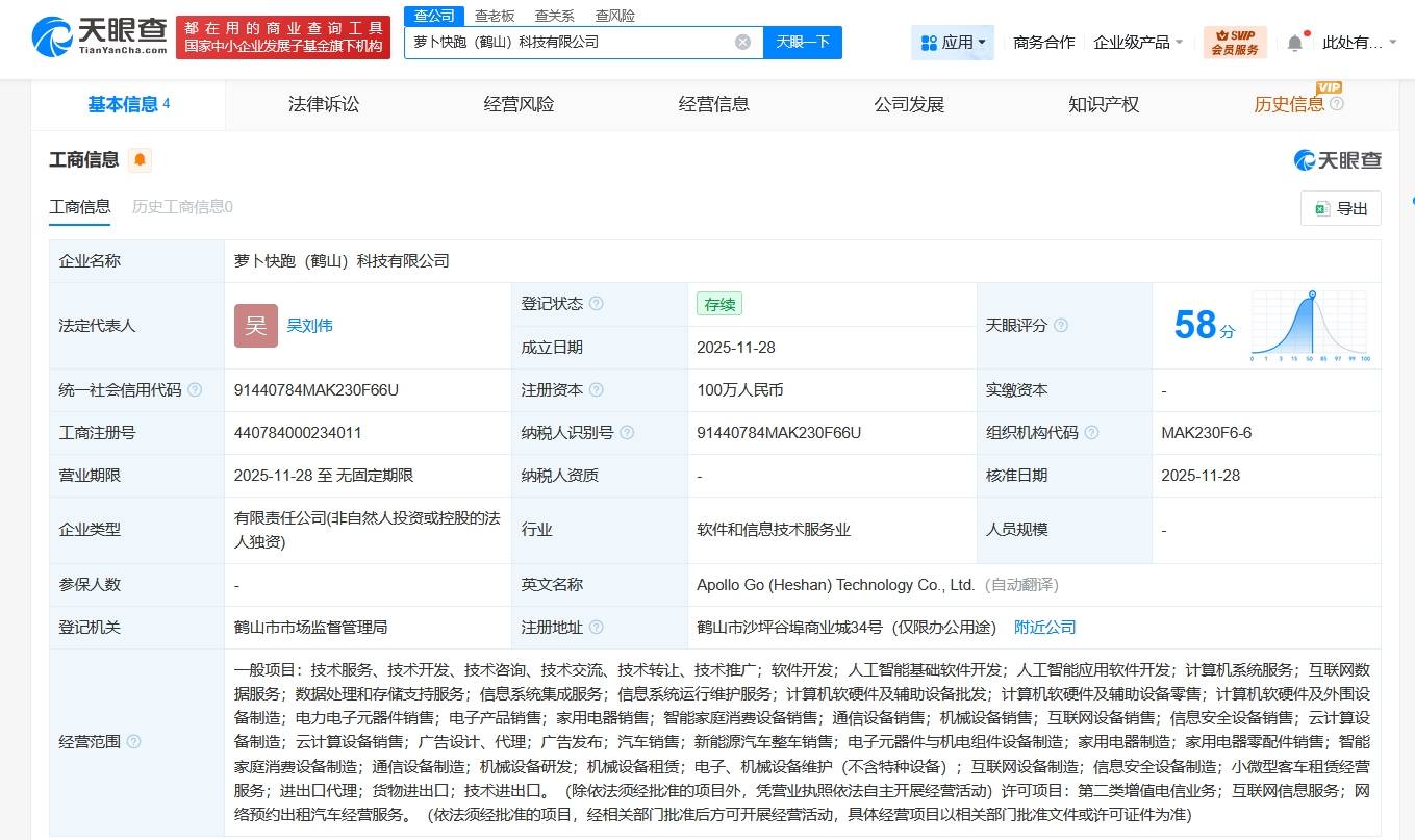 近日,一家名为萝卜快跑(鹤山)科技有限公司的新企业正式注册成立,引发市场关注。据公开信息显示,该公司法定代表人为吴刘伟,注册资本达100万元人民币,由萝卜运力(北京)科技有限公司全资控股。