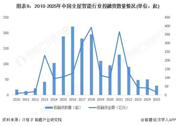 回顾历史数据,全屋智能行业的投融资数量和金额呈现波动趋势。2016年投融资数量达到峰值,共221件;2018年和2021年则出现融资金额高峰,分别达392.86亿元和367.75亿元。2024年全年融资事件为51件,融资金额41.98亿元;2025年1-10月,融资事件数量为30件,融资金额17.29亿元。尽管近期融资规模有所收缩,但行业整体仍保持活跃态势,资本对核心技术和创新模式的关注度持续升温。
