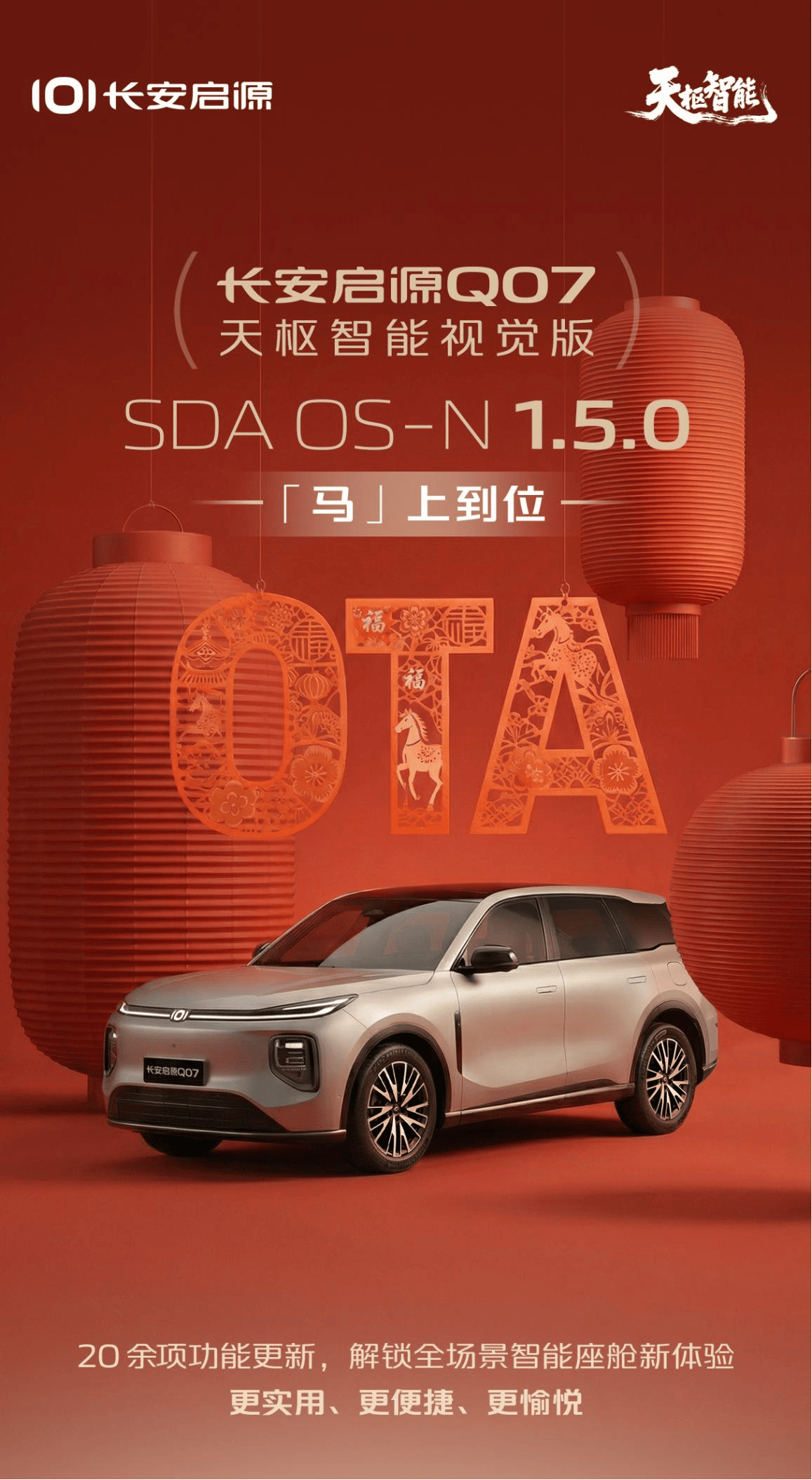 长安启源Q07天枢智能视觉版近日迎来SDA OS-N 1.5.0版本OTA升级,以多项创新功能进一步强化其“全家人的智能SUV”定位。此次更新不仅打通了手机与车机的生态壁垒,更通过个性化设置与舒适性优化,为用户带来更智能、更贴心的出行体验。