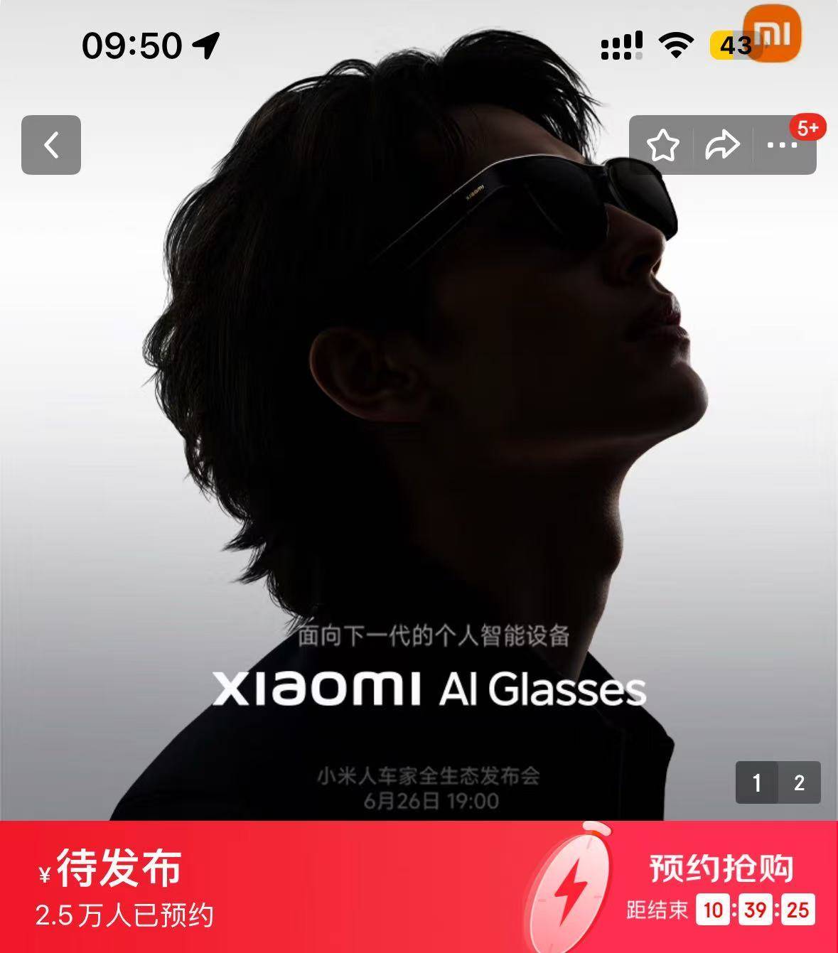 京东电商平台上,小米最新推出的AI眼镜引发了广泛关注。截至6月26日上午9时30分,该产品的预约人数已突破2.5万大关。