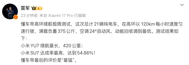 在懂车帝最新公布的纯电动车“极限续航测试”榜单中,小米汽车凭借两款车型的亮眼表现引发行业关注。测试结果显示,小米SU7以54.86%的续航达成率摘得20万元级车型桂冠,而小米YU7则以实测420公里的总里程成为同组别续航最长的车型,双双刷新市场对国产新能源车的性能认知。
