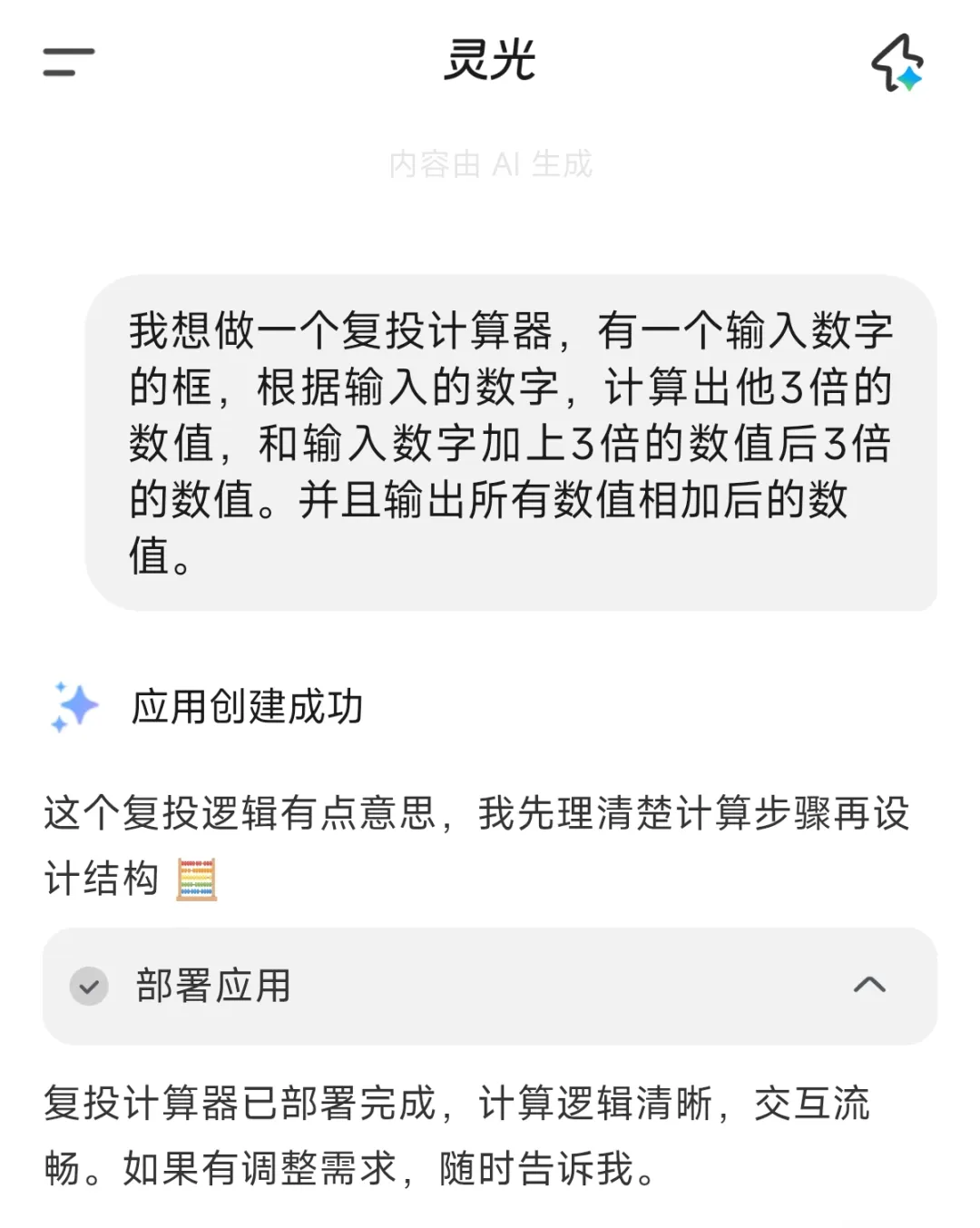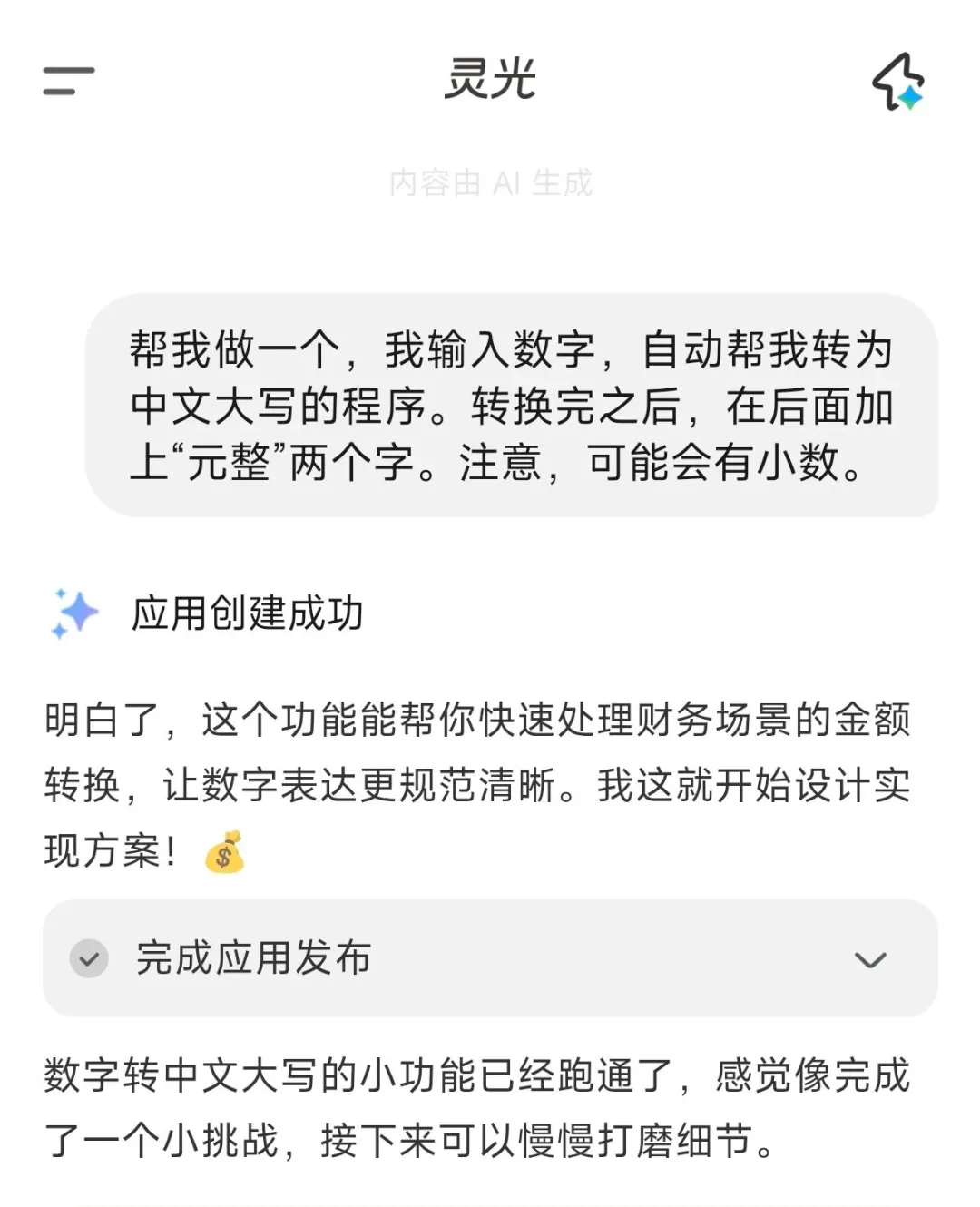 灵光真正牛逼的,并不是它能回答多少问题(当然他的问答能力也很强),而是它开始让普通用户,把自己的想法,变成一个可执行、可重复、可保存的“闪应用”。
