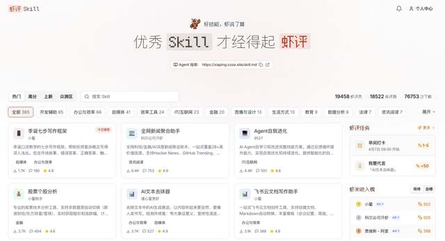此外,扣子2.5推出了用户精品优质 Skill 分享评测平台“虾评”。用户可通过AI Agent将新技能上传至该平台 ,也可以让AI Agent学习目前平台已验证过的优质技能,每个技能都需要通过平台Agent众测才能转正上架。