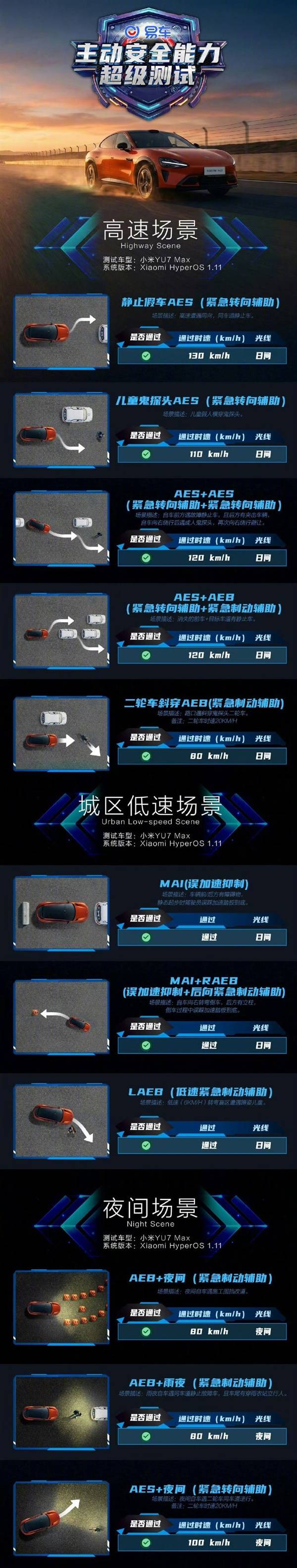 值得一提的是,此次测试还跨越了白昼与黑夜、晴天与雨天等不同环境条件。在雨天80km/h的盲测等复杂环境中,小米YU7依然能够保持稳定的性能表现,充分证明了其主动安全系统的可靠性和适应性。