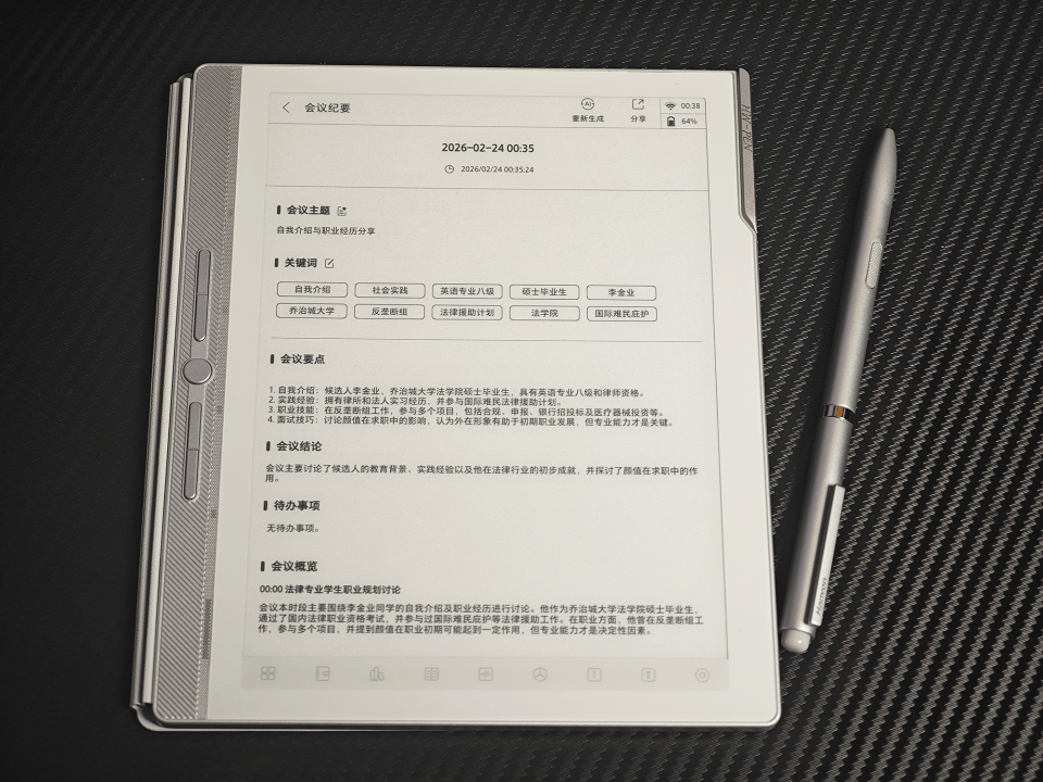 在核心办公场景中,三款产品均展现强大实力。语音转写功能支持四麦克风阵列收音,可精准区分讲话者角色并生成会议纪要。汉王机型凭借DeepSeek与通义千问双模型,在AI生成内容速度与简洁度上优于科大讯飞;后者则通过丰富场景分类提升使用效率。书写体验方面,汉王8192级压感笔实现笔触随力度变化,减屏层设计消除隔层干扰;科大讯飞4096级压感笔虽书写流畅,但精细绘图场景略显不足。