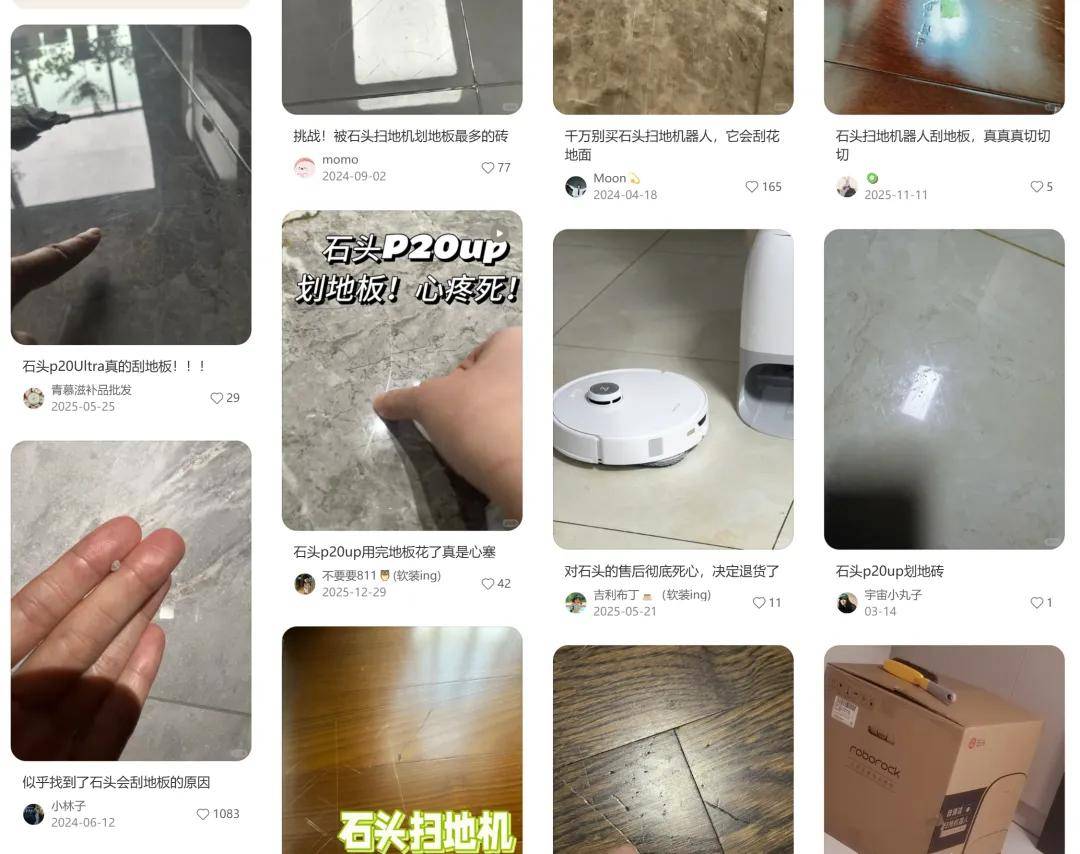 戴先生的遭遇并非个案。在小红书等平台搜索“石头扫地机 划伤”,大量用户分享了类似经历。从P10系列到P20系列,多款主力机型均被投诉导致瓷砖、木地板出现不可修复的划痕。有用户表示:“新房刚入住,扫地后出现一米多长的划痕,简直崩溃。”另有用户通过慢镜头回放发现,划痕多产生于机器旋转拖地时,且一旦出现便无法通过清洁或打磨消除。