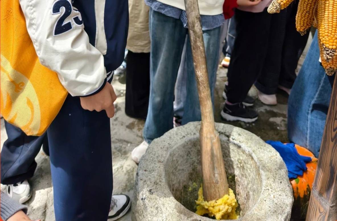 在羌寨民居的灶台旁,孩子们围坐一圈,跟着村民韩英嬢嬢学习制作洋芋糍粑。木槌捶打糯米的咚咚声与欢声笑语交织,构成一幅生动的文化传承画面。“大家合力捶打糍粑,象征着团圆和睦,就像我们羌族人邻里互助的传统。”韩英嬢嬢一边示范一边解释,软糯香甜的糍粑寓意着日子越过越滋润。孩子们品尝着自己亲手制作的美食,脸上洋溢着满足的笑容。