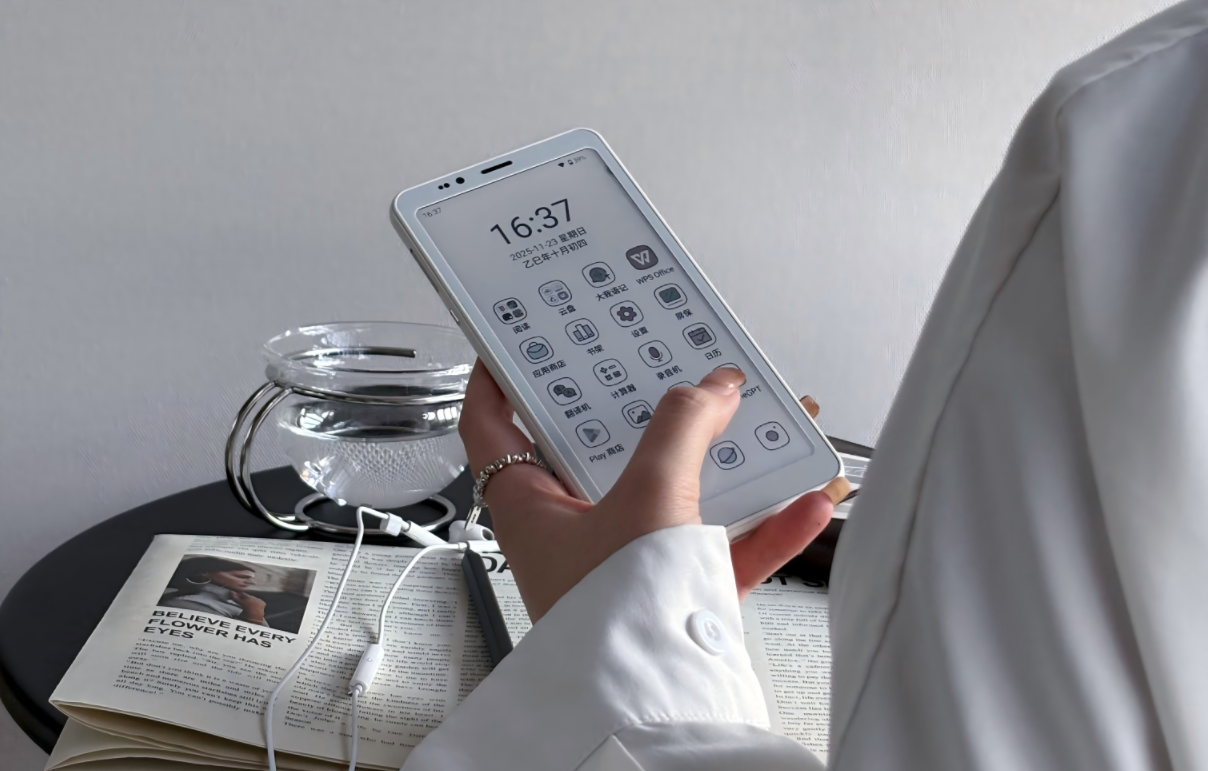 提供彩墨屏和 黑白墨水屏两种选择,黑白分辨率300PPI(824×1648),彩色150PPI(412×824)。53帧/秒刷新率、无蓝光、不伤眼,适合长时间使用,让智能手机变得护眼。