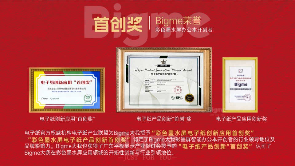 2020年,彩色墨水屏刚起步的时候。Bigme大我直接推出了全球首款10.3英寸彩色墨水屏智能办公本B1 Pro。在遍地黑白阅读器的市场里,这一步相当于踩进了彩色墨水屏办公本无人区。但在同年,Bigme大我居然相继拿下了官方权威机构电子纸产业联盟授予它“彩色墨水屏电子纸创新应用首创奖”和“彩色墨水屏电子纸产品创新首创奖”;2022年,广东平板显示产业促进会又颁发了“电子纸产品创新首创奖”。至此,Bigme大我已成为彩色墨水屏行业公认的领军品牌。